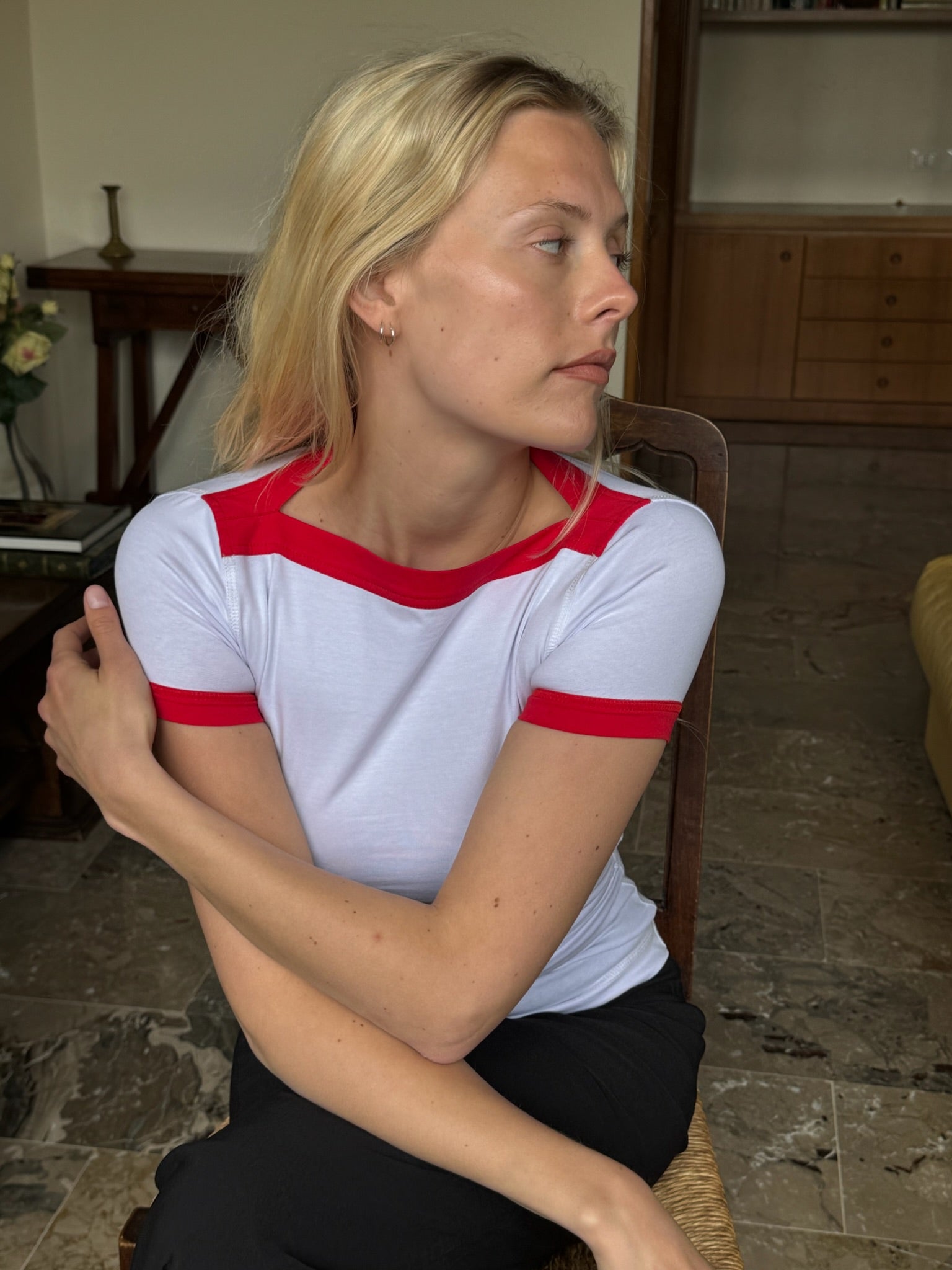This white slim fit short-sleeved t-shirt features a striking square neckline and bold red contrast trim at the collar and sleeves. Made from 100% soft cotton, it offers all-day comfort and breathability — perfect for everyday wear or layered looks.