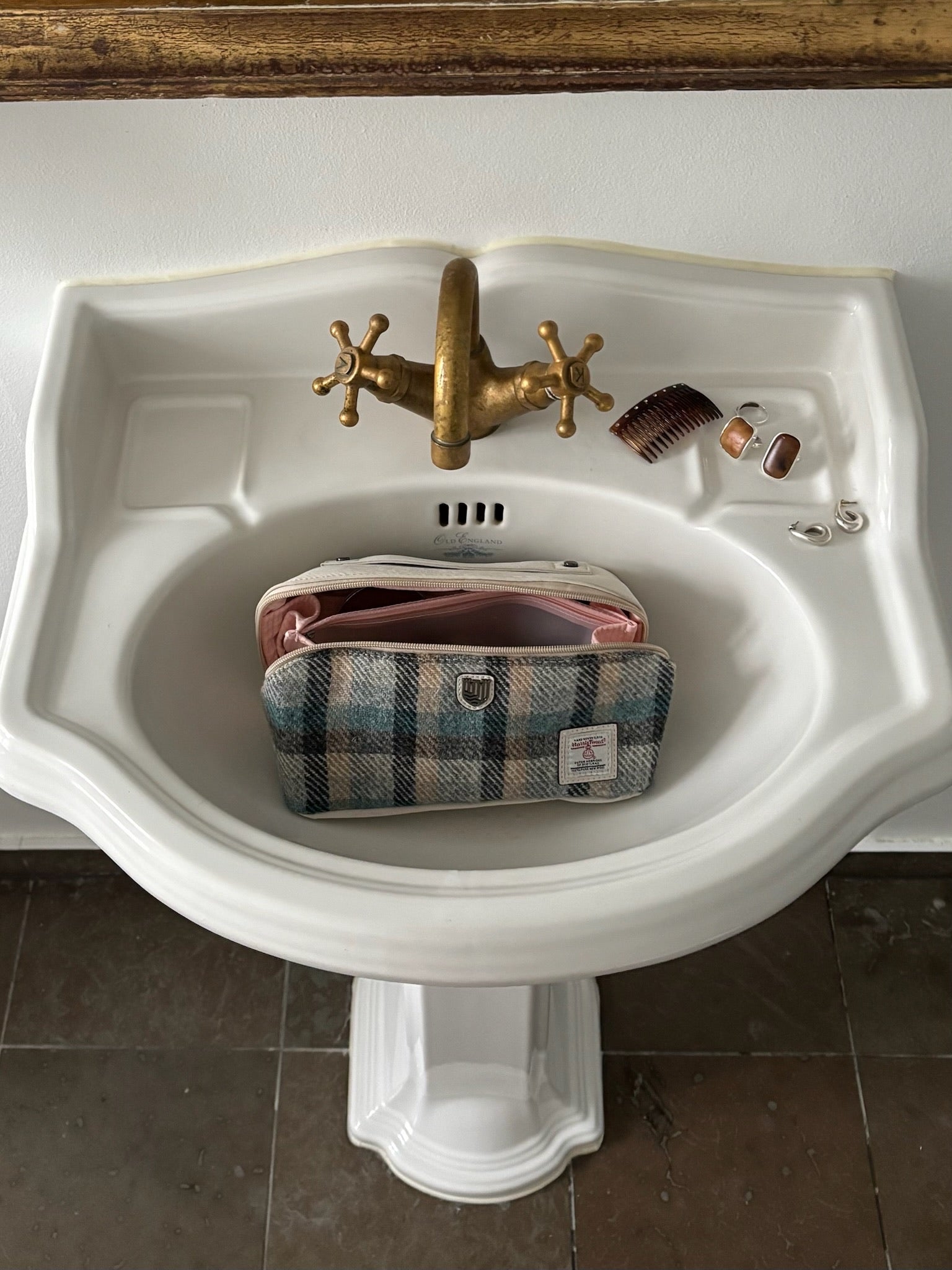 Toiletry bag made from Harris tweed and vegan leather. Has a waterproof zipped pocket inside.